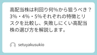 高配当株は利回り何%から狙うべき?3%・4%・5%それぞれの特徴とリスクを比較し、失敗しにくい高配当株の選び方を解説します。